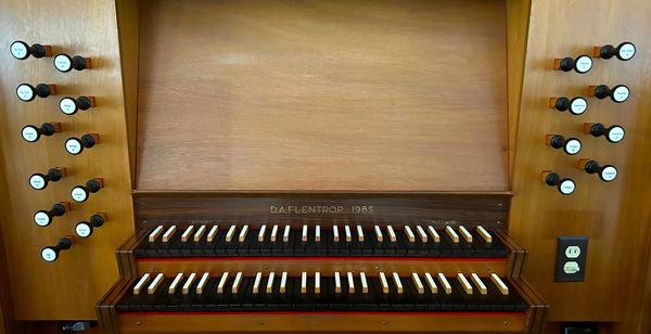 Pipe organs are usually described by the number of manuals (keyboards), then the number of stops (voices), and lastly the number of ranks (groups of pipes). Our Flentrop has two manuals, 18 stops, and 28 ranks.